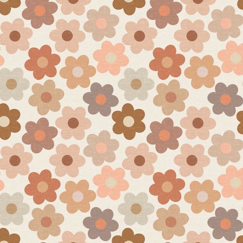 Design of Brown, Orange, Textile, Material property, Pattern, Circle, Symmetry, Font, Tints and shades, Peach, with white, brown, yellow, pink colors, and tagged with patterns, flowers, flowers, daisy.