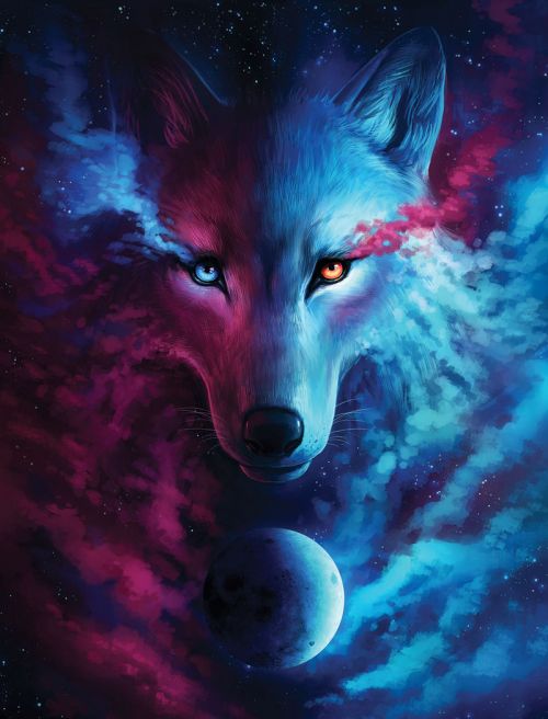 Design of Dog, Carnivore, Organism, Iris, Painting, Art, Whiskers, Cg artwork, Electric blue, Space, with black, blue, purple, red colors, and tagged with animals, space, blue, moon, purple, sky, wolf.