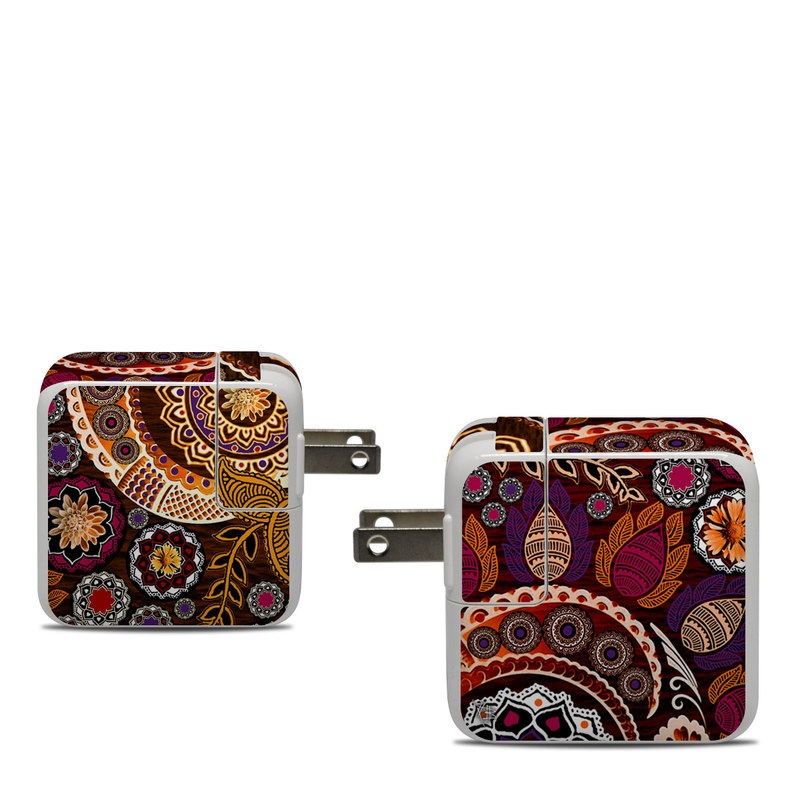 iStyles Apple 30W USB-C Power Adapter Skin design of Pattern, Motif, Visual arts, Design, Art, Floral design, Textile, Paisley, Tapestry, Circle, with brown, purple, red, white, black colors, and tagged with patterns, flowers, nature.