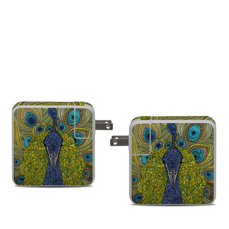 iStyles Apple 61W USB-C Power Adapter Skin design of Peafowl, Bird, Feather, Pattern, Art, Phasianidae, Galliformes, Design, Psychedelic art, Symmetry, with green, blue, yellow colors, and tagged with animals, patterns, animals, feathers, peacock, feathers.