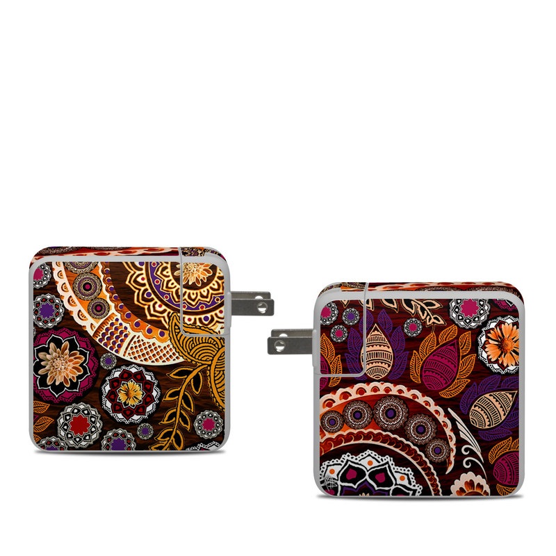 iStyles Apple 61W USB-C Power Adapter Skin design of Pattern, Motif, Visual arts, Design, Art, Floral design, Textile, Paisley, Tapestry, Circle, with brown, purple, red, white, black colors, and tagged with patterns, flowers, nature.