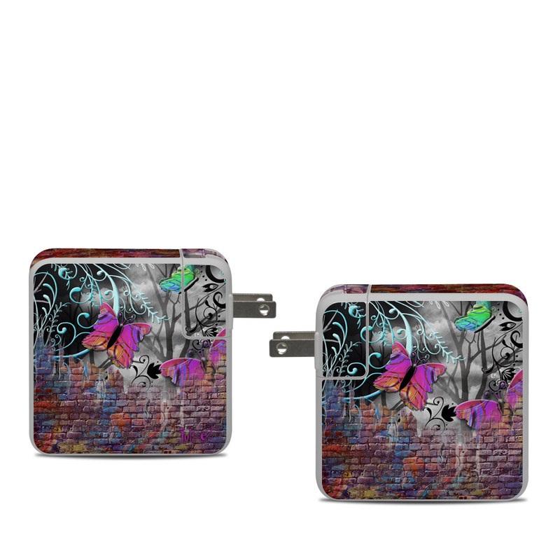 iStyles Apple 61W USB-C Power Adapter Skin design of Purple, Graphic design, Art, Pattern, Graffiti, Organism, Street art, Wall, Font, Illustration, with red, black, gray, purple, orange, blue, green colors, and tagged with abstract, animals.