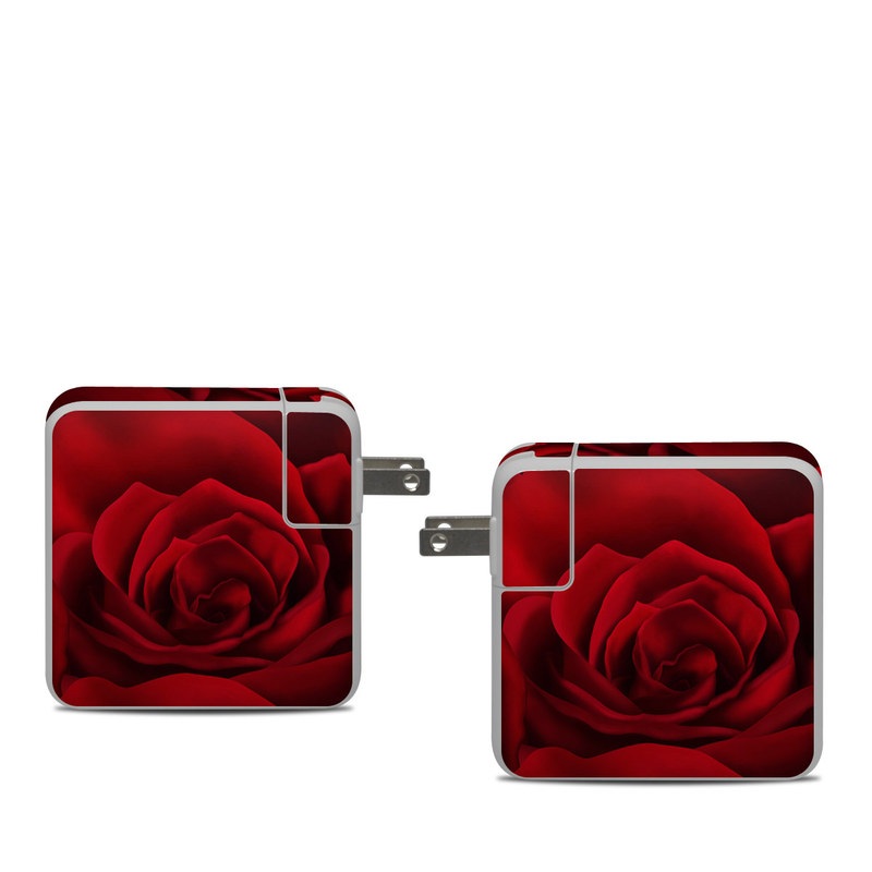 iStyles Apple 61W USB-C Power Adapter Skin design of Red, Garden roses, Rose, Petal, Flower, Nature, Floribunda, Rose family, Close-up, Plant, with black, red colors, and tagged with flowers, patterns, photos.