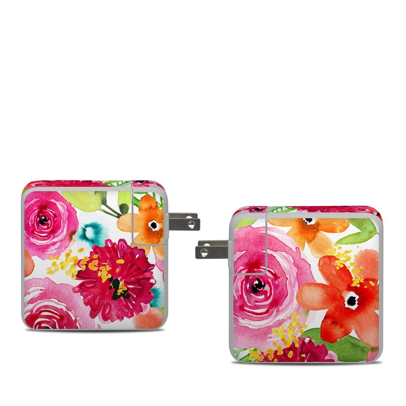 iStyles Apple 61W USB-C Power Adapter Skin design of Flower, Cut flowers, Floral design, Plant, Pink, Bouquet, Petal, Flower Arranging, Artificial flower, Clip art, with pink, red, green, orange, yellow, blue, white colors, and tagged with flowers, patterns, bloom, blooms, florals, flowers, pink, watercolor.