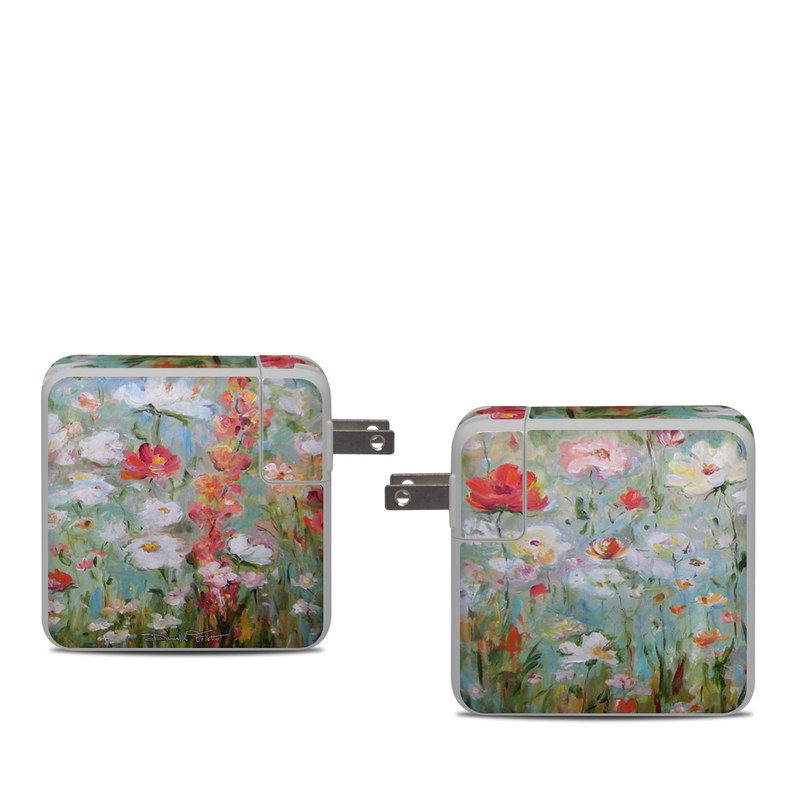 iStyles Apple 61W USB-C Power Adapter Skin design of Flower, Painting, Watercolor paint, Plant, Modern art, Wildflower, Botany, Meadow, Acrylic paint, Flowering plant, with gray, black, green, red, blue colors, and tagged with patterns, flowers.