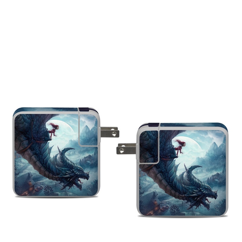 iStyles Apple 61W USB-C Power Adapter Skin design of Dragon, Cg artwork, Illustration, Action-adventure game, Fictional character, Mythical creature, Mythology, Fiction, Cryptid, Extinction, with blue, white, brown, green colors, and tagged with fantasy, animals, people, nature, urban, dragon, fantasy, girl, night, woman.