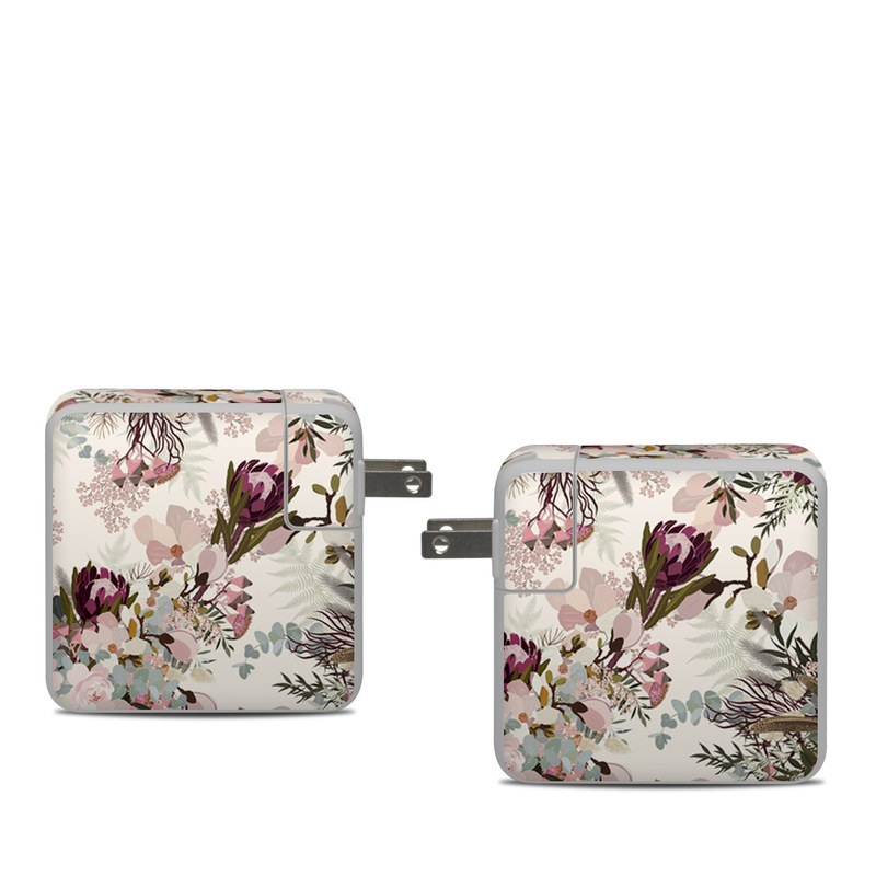 iStyles Apple 61W USB-C Power Adapter Skin design of Pink, Pattern, Lilac, Flower, Plant, Petal, Floral design, Textile, Design, Blossom, with white, red, pink, blue, brown colors, and tagged with patterns, flowers, nature, bouquet, filigree, floral, flower, flowers, pastel.