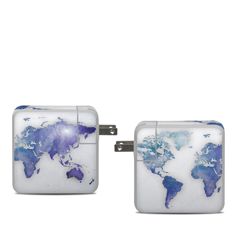 iStyles Apple 61W USB-C Power Adapter Skin design of World, Map, Watercolor paint, Illustration, with white, blue, purple colors, and tagged with maps, globe, map, pastel, travel, watercolor, world.