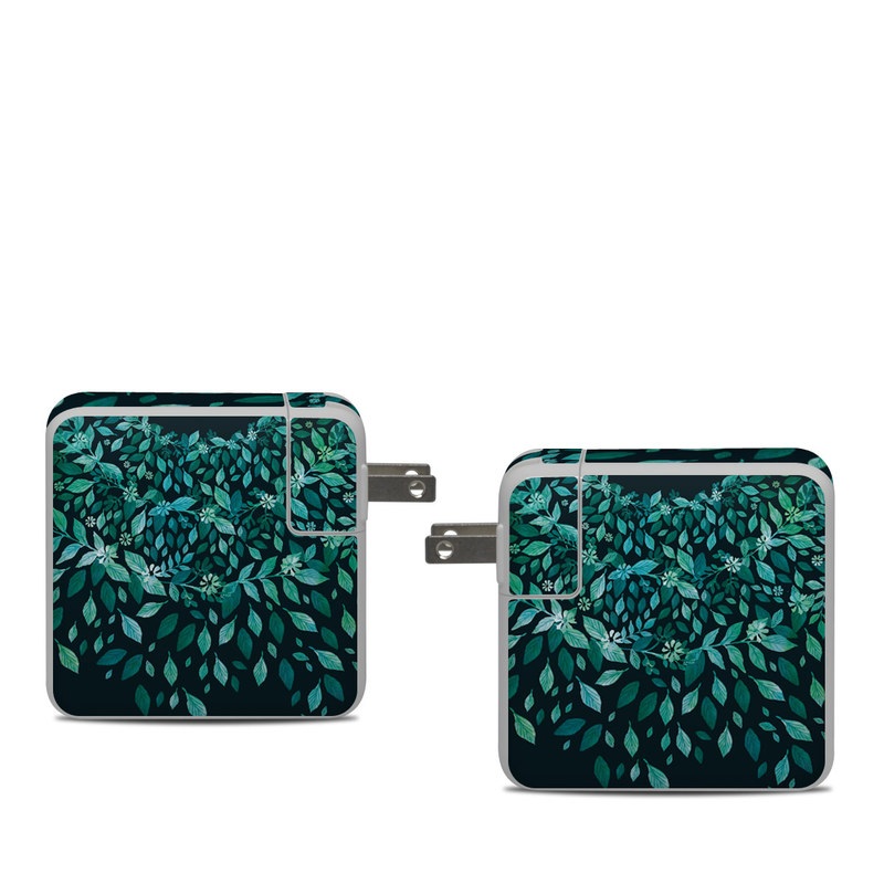 iStyles Apple 61W USB-C Power Adapter Skin design of Green, Aqua, Organism, Turquoise, Natural environment, Teal, Marine biology, Water, Leaf, Plant, with black, green, white colors, and tagged with patterns, nature, flowers, blue, flowers, green, leaves, nature, wreath.