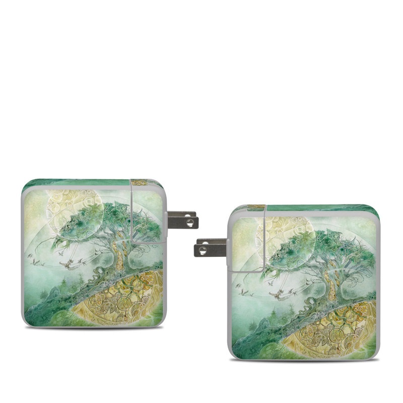 iStyles Apple 61W USB-C Power Adapter Skin design of Illustration, Organism, Art, World, Fictional character, with green, yellow, brown colors, and tagged with animals, nature, people, objects, birds, gears, swing, tree.