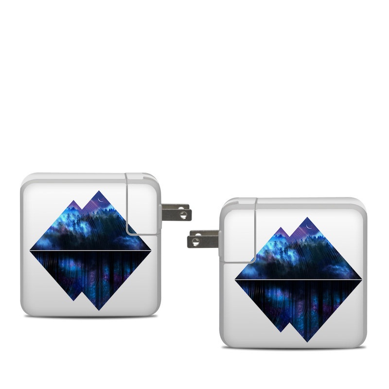 iStyles Apple 61W USB-C Power Adapter Skin design of Blue, Cobalt blue, Pyramid, Pattern, Electric blue, Design, Fractal art, Sky, Triangle, Space, with white, blue, purple, black colors, and tagged with nature, objects, space, signs, earth, geometry, moon, mountains, nature, plants, space, stars, trees, water.
