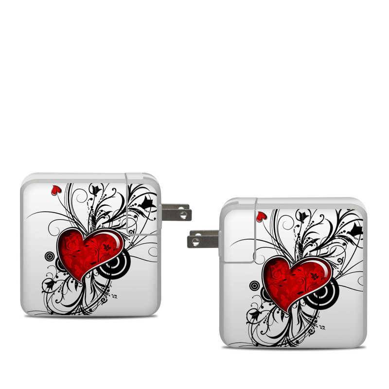 iStyles Apple 61W USB-C Power Adapter Skin design of Heart, Line art, Love, Clip art, Plant, Graphic design, Illustration, with white, gray, black, red colors, and tagged with hearts, flowers.