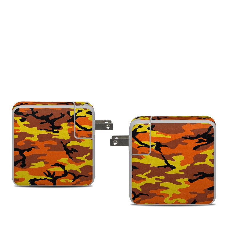 iStyles Apple 61W USB-C Power Adapter Skin design of Military camouflage, Orange, Pattern, Camouflage, Yellow, Brown, Uniform, Design, Tree, Wildlife, with red, green, black colors, and tagged with military, lookslike, patterns.