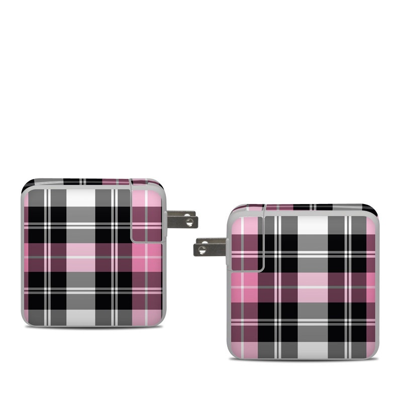 iStyles Apple 61W USB-C Power Adapter Skin design of Plaid, Tartan, Pattern, Pink, Purple, Violet, Line, Textile, Magenta, Design, with black, gray, pink, red, white, purple colors, and tagged with patterns.