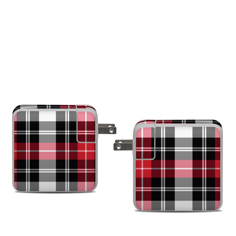 iStyles Apple 61W USB-C Power Adapter Skin design of Plaid, Tartan, Pattern, Red, Textile, Design, Line, Pink, Magenta, Square, with black, gray, pink, red, white colors, and tagged with patterns.