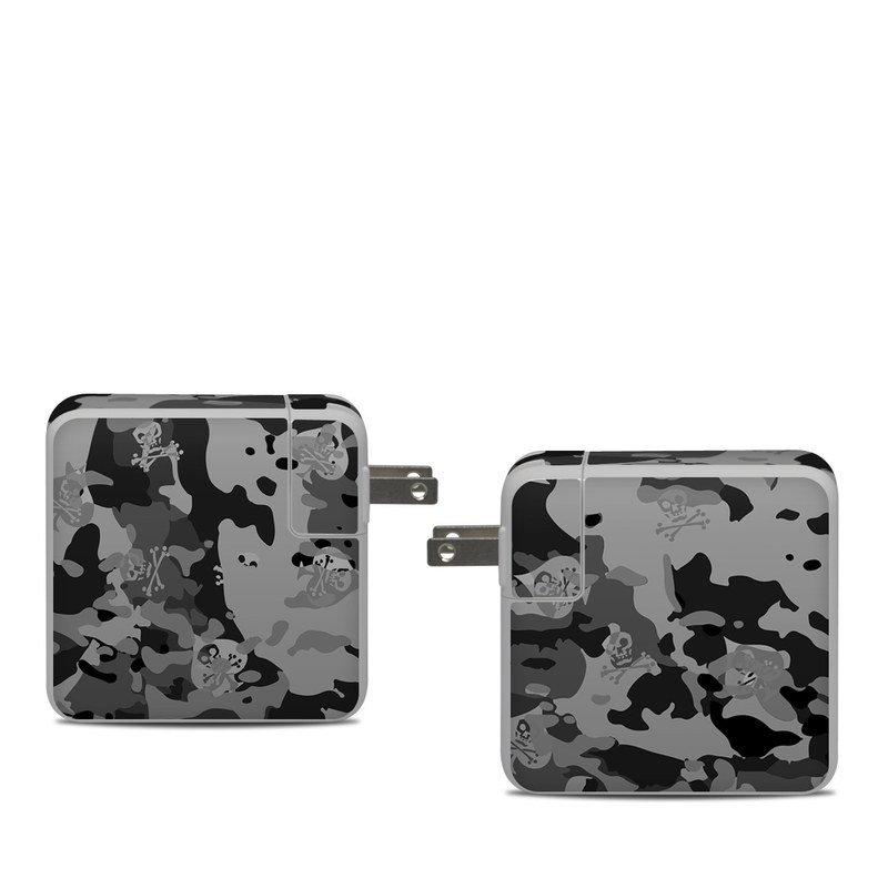 iStyles Apple 61W USB-C Power Adapter Skin design of Military camouflage, Pattern, Design, Camouflage, Illustration, Uniform, Black-and-white, Wallpaper, Art, with black, gray colors, and tagged with military, skulls, patterns, athlete, fitness, gym, skull, skulls, spade.