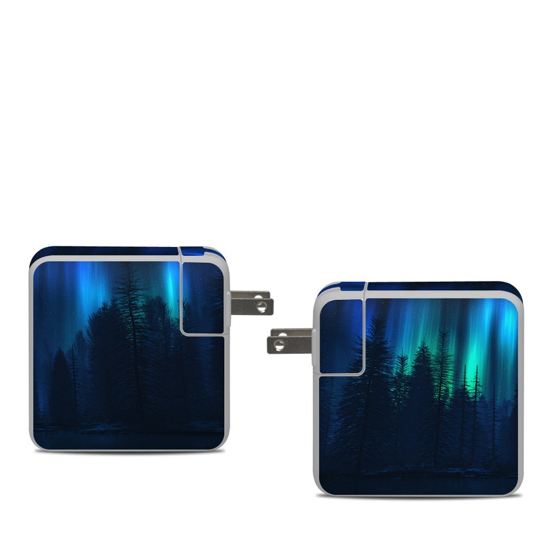iStyles Apple 61W USB-C Power Adapter Skin design of Blue, Light, Natural environment, Tree, Sky, Forest, Darkness, Aurora, Night, Electric blue, with black, blue colors, and tagged with nature.