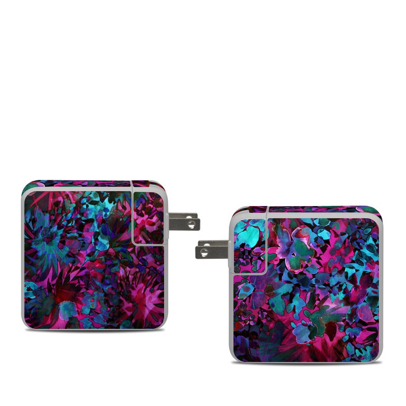 iStyles Apple 61W USB-C Power Adapter Skin design of Pink, Purple, Violet, Lilac, Flower, Leaf, Plant, Magenta, Botany, Pattern, with black, pink, purple, blue, green colors, and tagged with patterns, flowers, abstract, abstract, bright, colorful, floral, flowers, summer, tropical, watercolor.