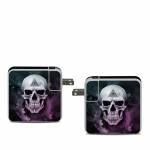 iStyles Apple 61W USB-C Power Adapter Skin design of Skull, Bone, Illustration, Font, Jaw, Fictional character, Graphic design, Graphics, Art, with black, white, gray, purple colors, and tagged with signs, skulls, space, galaxy, geometric, goth, gothic, skull, space.