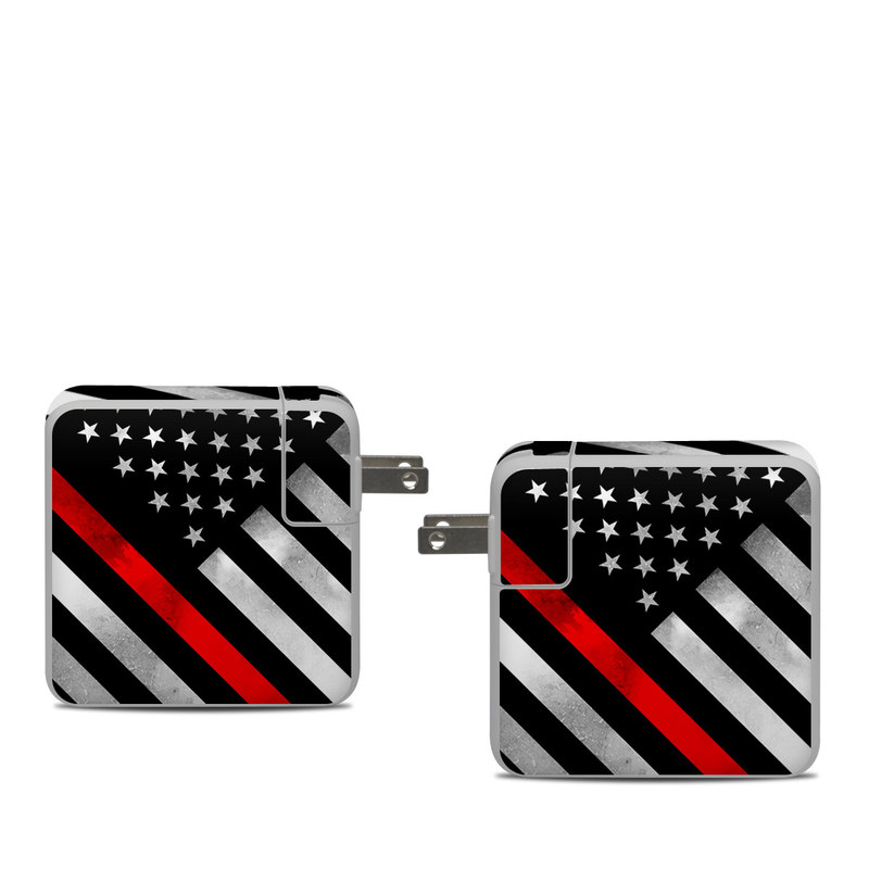 iStyles Apple 61W USB-C Power Adapter Skin design of Flag of the united states, Flag, Line, Black-and-white, Pattern, Flag Day (USA), Veterans day, Independence day, Memorial day, with black, white, gray, red colors, and tagged with flags, signs, fire, firstresponder, flag, rescue, thinline.