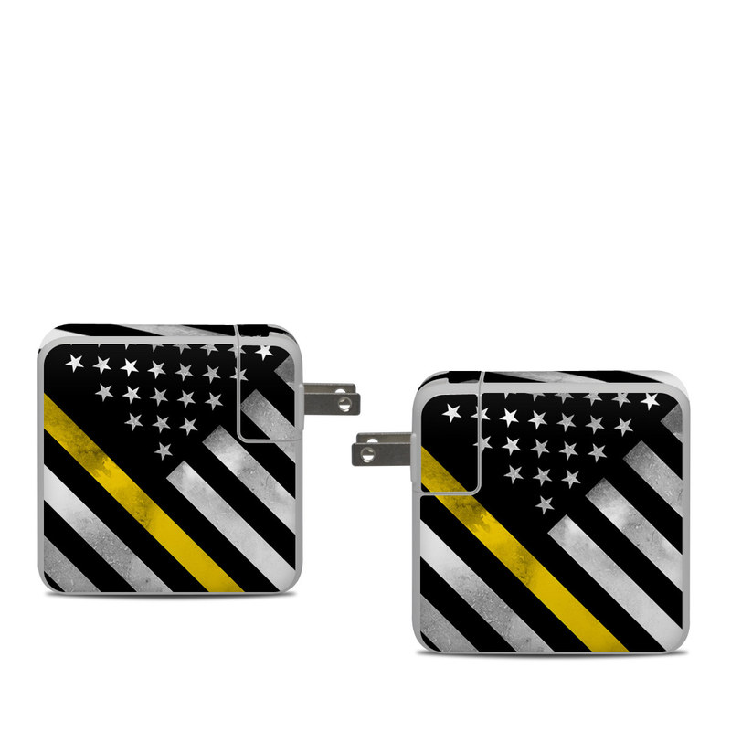 iStyles Apple 61W USB-C Power Adapter Skin design of Flag of the united states, Flag, Yellow, Line, Black-and-white, Pattern, Monochrome, Graphic design, Parallel, with black, white, gray, yellow colors, and tagged with flags, signs, ems, fire, firstresponder, flag, police, rescue, thinline.