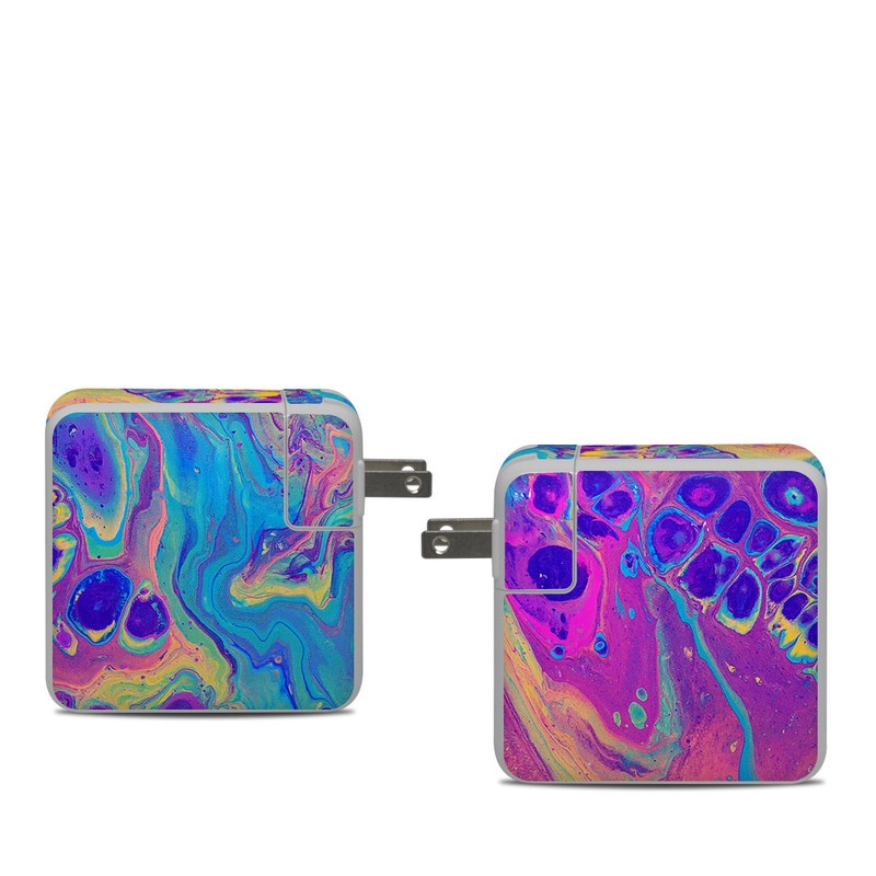 iStyles Apple 61W USB-C Power Adapter Skin design of Psychedelic art, Pattern, Purple, Visual arts, Design, Art, Fractal art, Electric blue, Graphic design, Graphics, with blue, yellow, purple, pink colors, and tagged with abstract, fantasy, marble, paint, painting, rainbow, soap, tiedye.