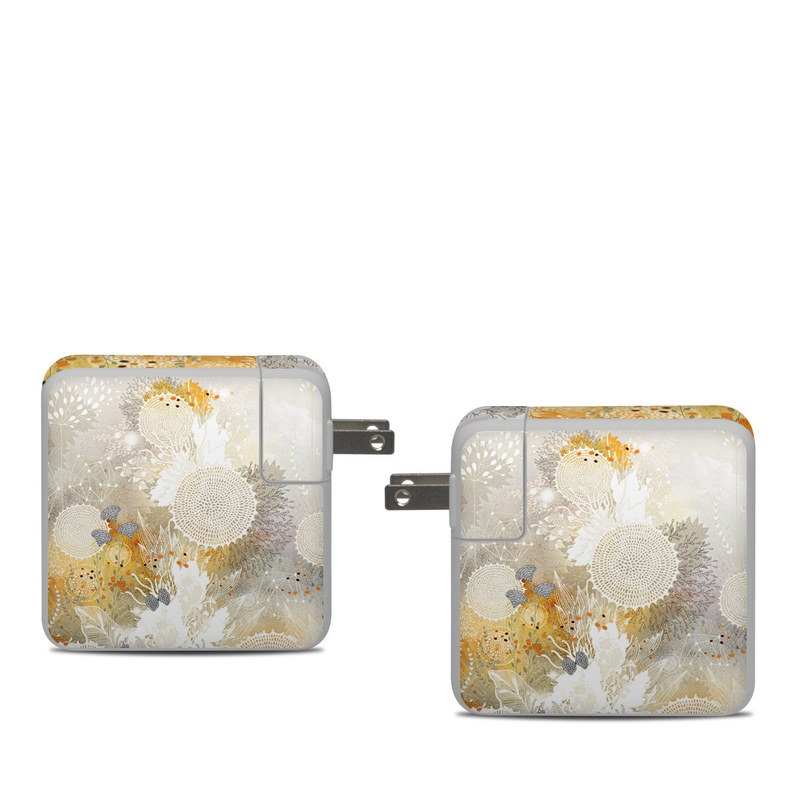 iStyles Apple 61W USB-C Power Adapter Skin design of Pattern, Floral design, Flower, Plant, Illustration, camomile, Wildflower, Art, with gray, yellow, pink, white, green colors, and tagged with patterns, nature, flowers.