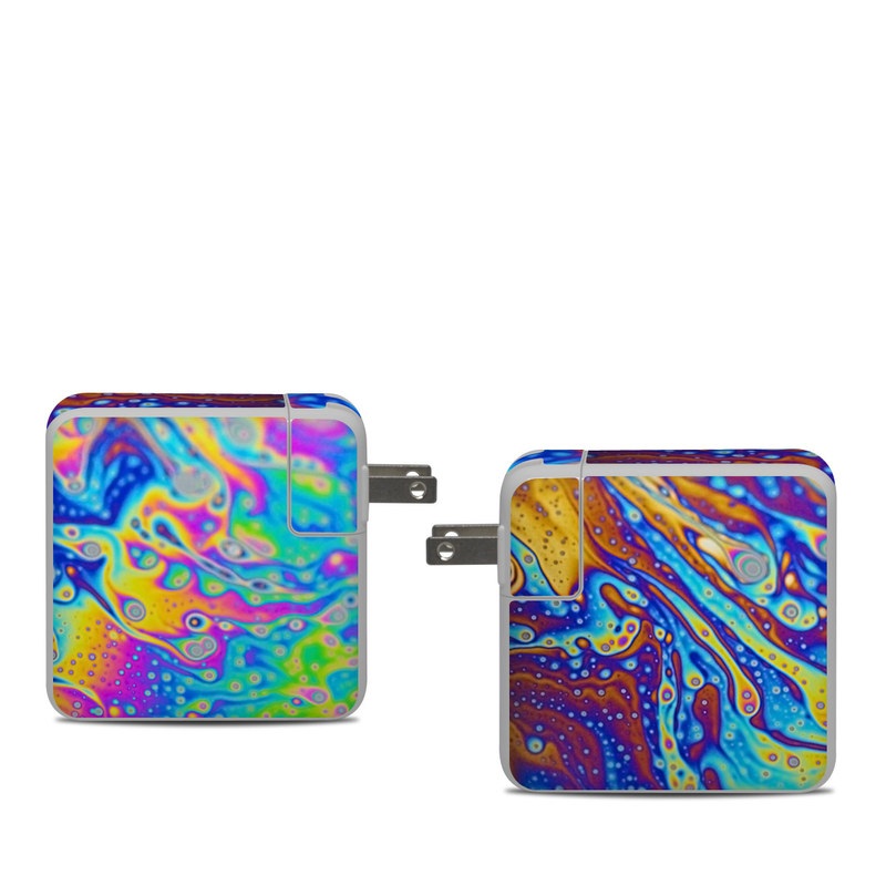 iStyles Apple 61W USB-C Power Adapter Skin design of Psychedelic art, Blue, Pattern, Art, Visual arts, Water, Organism, Colorfulness, Design, Textile, with gray, blue, orange, purple, green colors, and tagged with patterns.