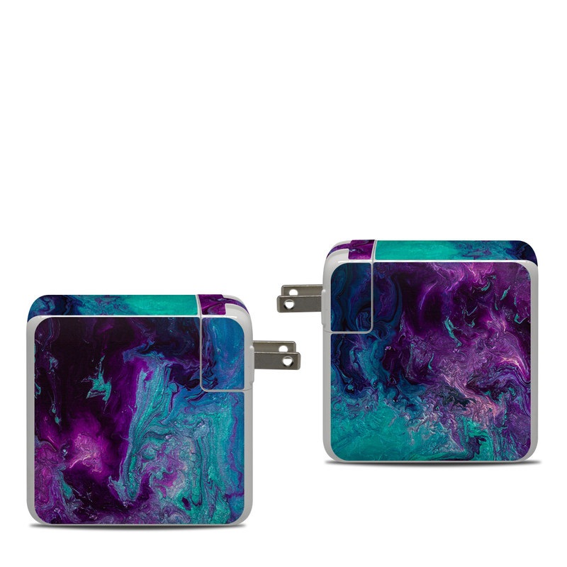 iStyles Apple 87W USB-C Power Adapter Skin design of Blue, Purple, Violet, Water, Turquoise, Aqua, Pink, Magenta, Teal, Electric blue, with blue, purple, black colors, and tagged with abstract, space, galaxy, marbles, milkyway, nebula, space.