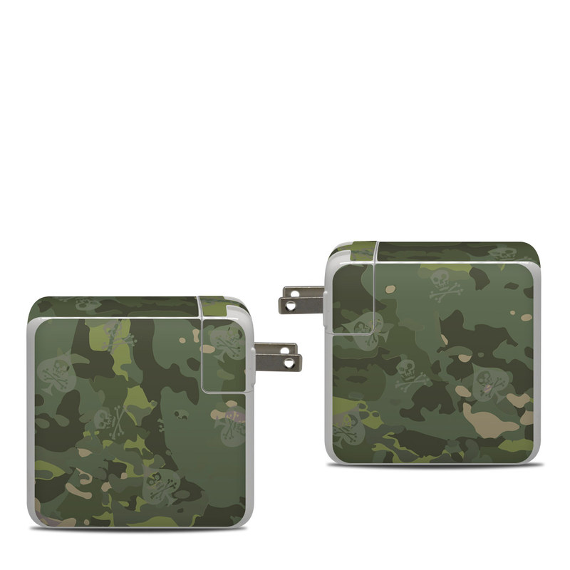 iStyles Apple 87W USB-C Power Adapter Skin design of Military camouflage, Pattern, Camouflage, Uniform, Clothing, Green, Design, Leaf, Plant, Illustration, with green, brown colors, and tagged with military, skulls, patterns, athlete, fitness, gym, skull, skulls, spade.