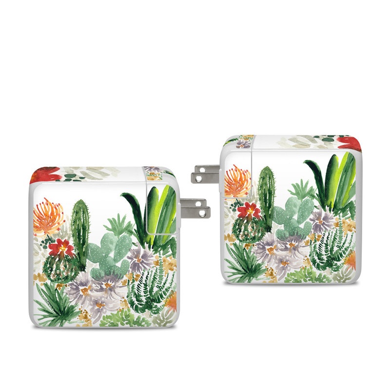iStyles Apple 96W USB-C Power Adapter Skin design of Cactus, Plant, Flower, Botany, Leaf, Illustration, Pine, Grass, Succulent plant, Branch, with white, green, red, orange colors, and tagged with flowers, nature, agave, cactus, desert, flowers, succulents.