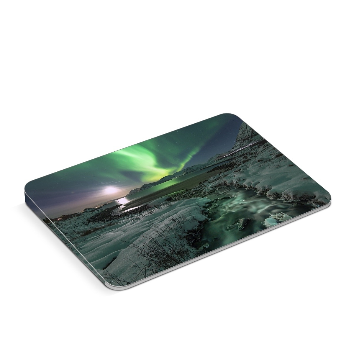 iStyles Apple Magic Trackpad Skin design of Nature, Aurora, Sky, Geological phenomenon, Water, Atmosphere, Space, Landscape, World, Glacier, with white, green, blue, black, gray colors, and tagged with nature, photos, arctic, cold, mountains, northernlights, photography, snow.