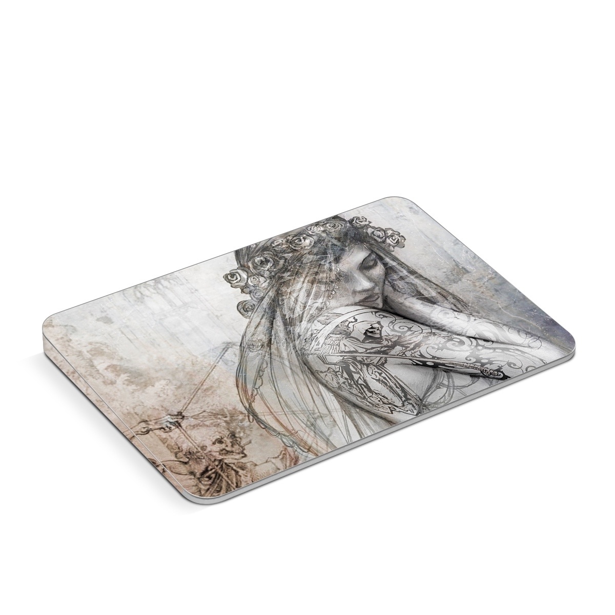 iStyles Apple Magic Trackpad Skin design of Lady, Art, Illustration, Drawing, Painting, Sketch, Mythology, Figure drawing, Long hair, Visual arts, with white, gray, black colors, and tagged with skulls, people, flowers, fantasy, death, ghost, goth, gothic, scythe, skull, tattoo.