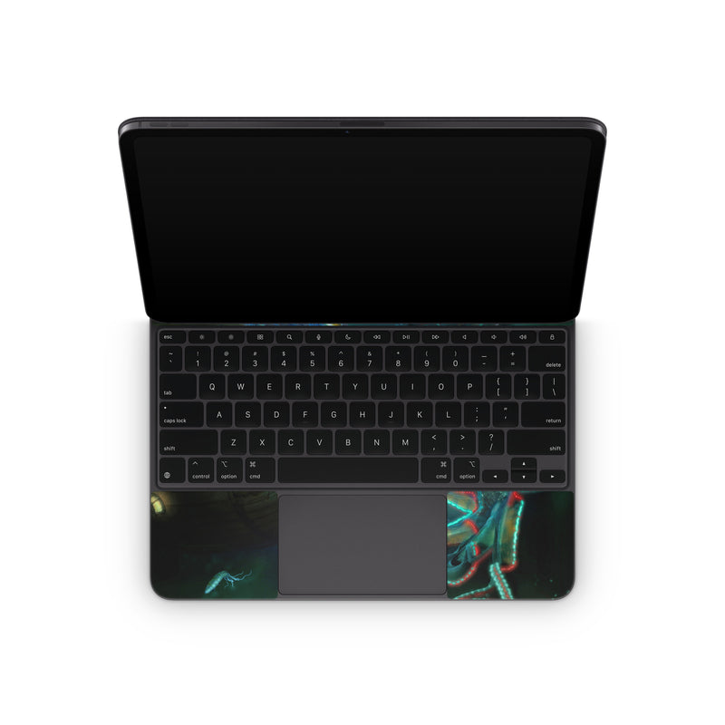 iStyles Magic Keyboard for iPad Series Skin design of Cg artwork, Illustration, Art, Fictional character, Fiction, Space, Fractal art, Graphic design, Mythology, Graphics, with black, gray, blue, green colors, and tagged with people, objects, fantasy, fantasy, mermaid, mythicalcreature, ocean, seacreature, sealife.