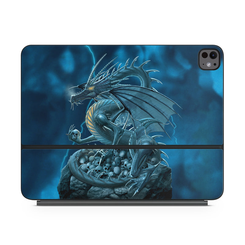 iStyles Magic Keyboard for iPad Series Skin design of Cg artwork, Dragon, Mythology, Fictional character, Illustration, Mythical creature, Art, Demon, with blue, yellow colors, and tagged with fantasy, skulls.