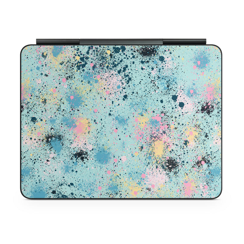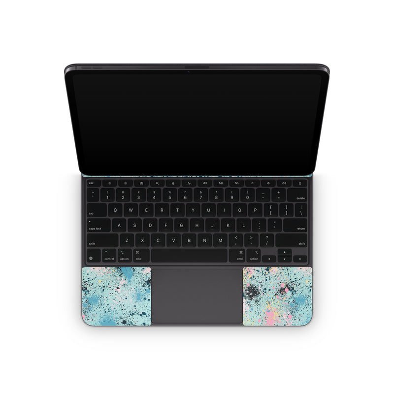 iStyles Magic Keyboard for iPad Series Skin design of Colorfulness, Art, Paint, Aqua, Art paint, Pattern, Tints and shades, Magenta, Electric blue, Creative arts, with blue, black, pink, yellow colors, and tagged with patterns, abstract, blue, collage, ink, paint, pink, splatter, yellow.
