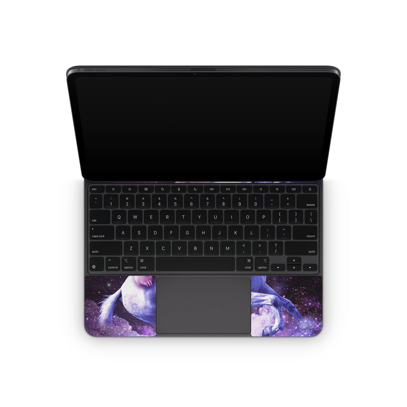 iStyles Magic Keyboard for iPad Series Skin design of Purple, Unicorn, Fictional character, Violet, Mythical creature, Illustration, Sky, Graphic design, Space, Constellation, with black, white, blue, purple, gray, brown colors, and tagged with space, animals, fantasy, animals, funny, galaxy, lasers, random, space, weird.