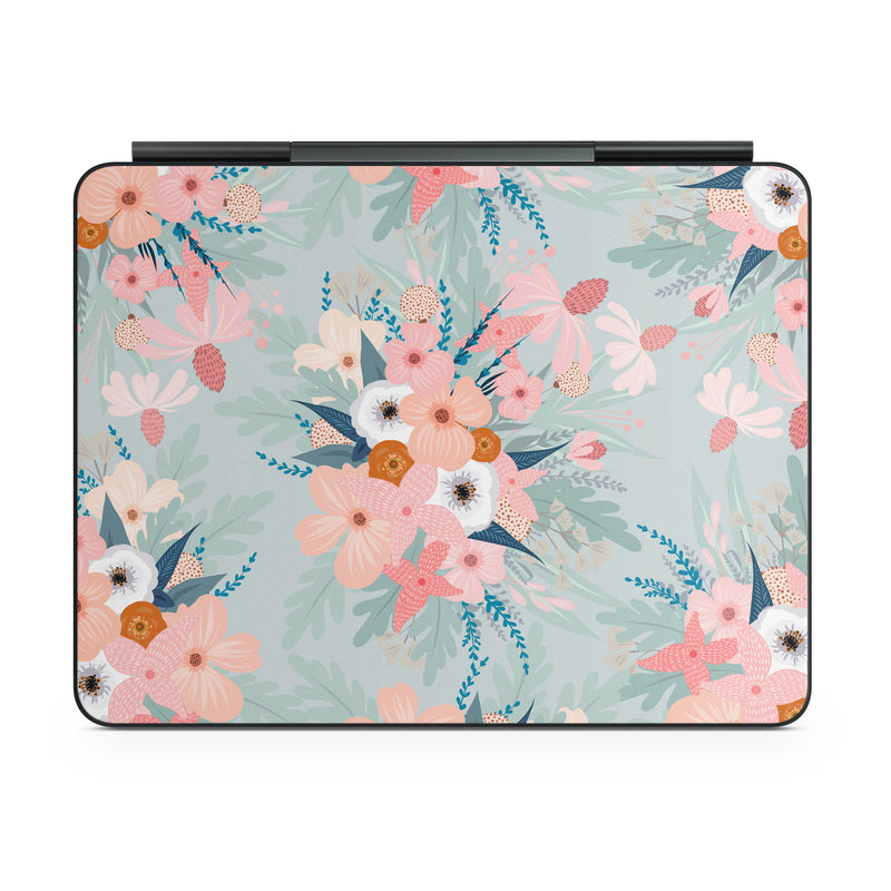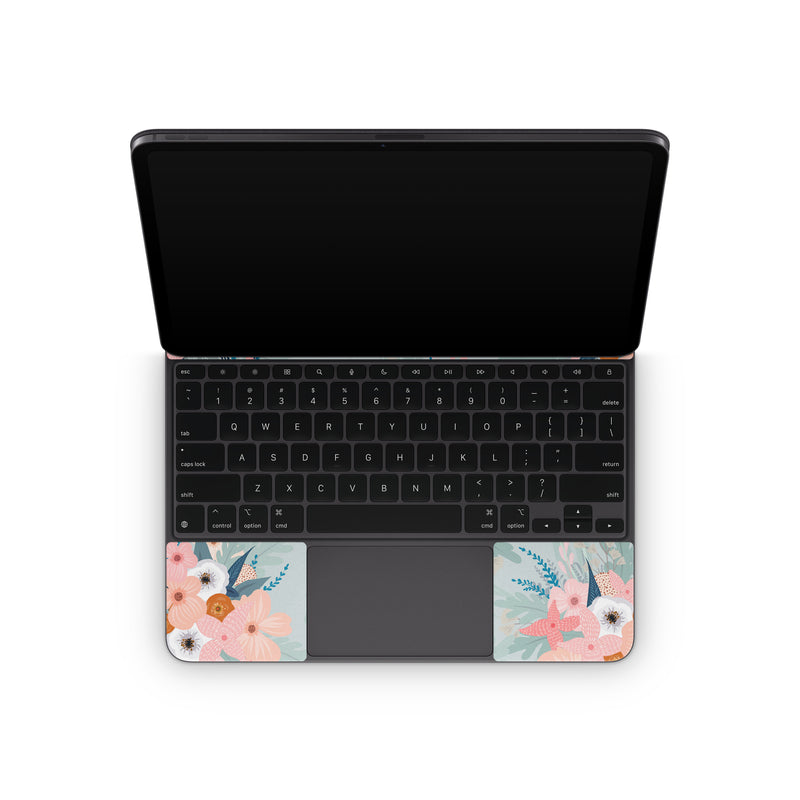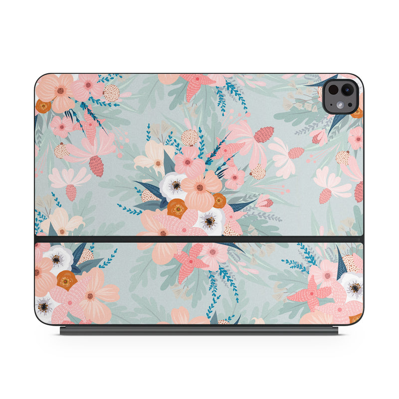 iStyles Magic Keyboard for iPad Series Skin design of Pattern, Aqua, Wrapping paper, Textile, Design, Floral design, Wildflower, Plant, Pedicel, Blossom, with pink, red, blue, white colors, and tagged with patterns, flowers, florals, flowers, garden, green, pastelcolors, pink.