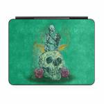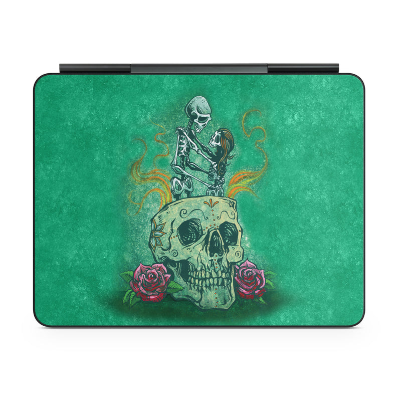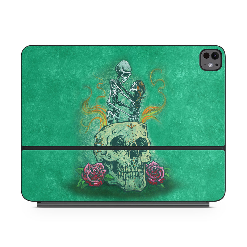iStyles Magic Keyboard for iPad Series Skin design of Bone, Skull, Aqua, Pattern, Electric blue, Fashion accessory, Font, Fictional character, Art, Grass, with green, pink, red, yellow, orange, white, gray colors, and tagged with skulls, flowers, flames, couple, eternal, love, flames, roses.
