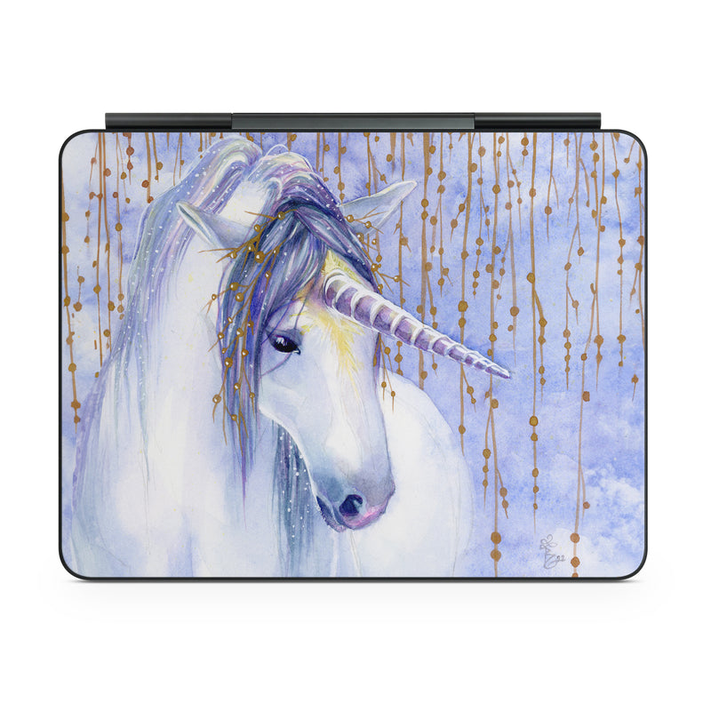 iStyles Magic Keyboard for iPad Series Skin design of Horse, Eyelash, Painting, Working animal, Line, Art, Paint, Snout, Pack animal, Illustration, with white, purple, brown, yellow colors, and tagged with animals, fantasy, unicorn, tiara, horn.