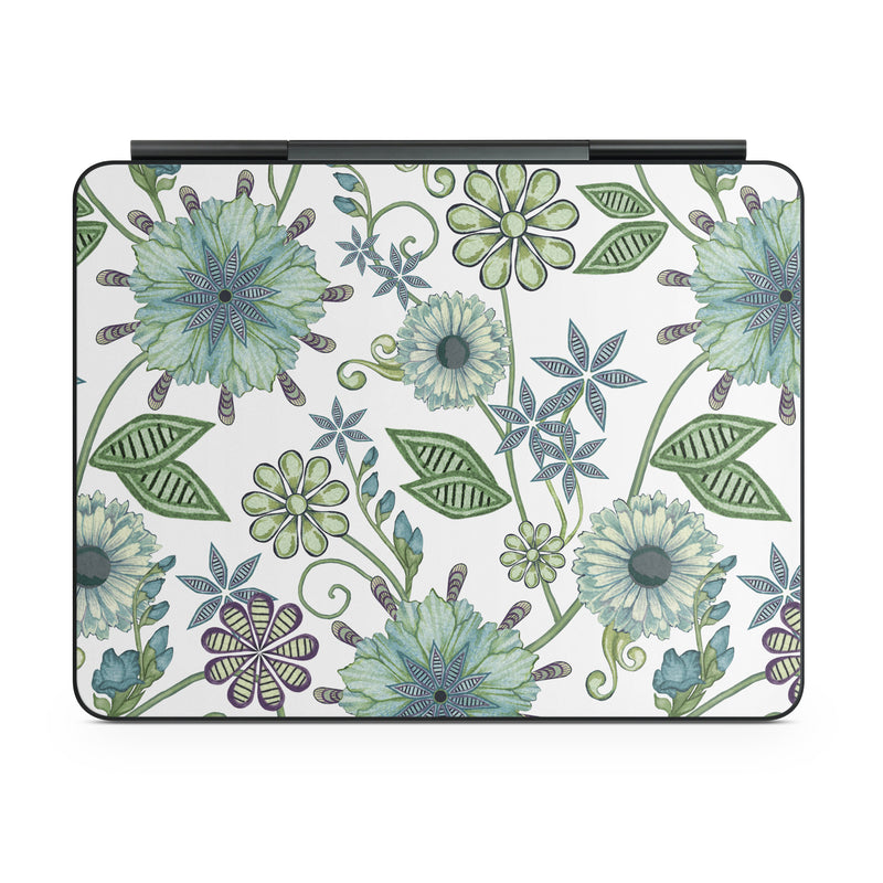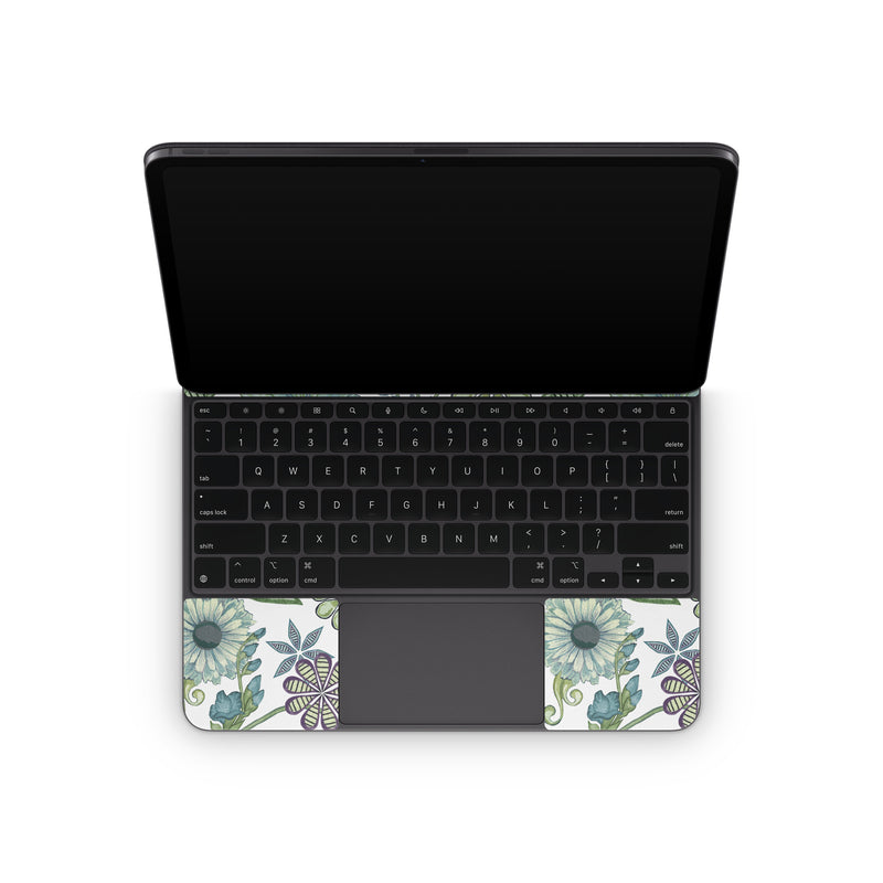 iStyles Magic Keyboard for iPad Series Skin design of Green, Pattern, Flower, Botany, Plant, Leaf, Design, Wildflower, with white, green, blue colors, and tagged with patterns, flowers.