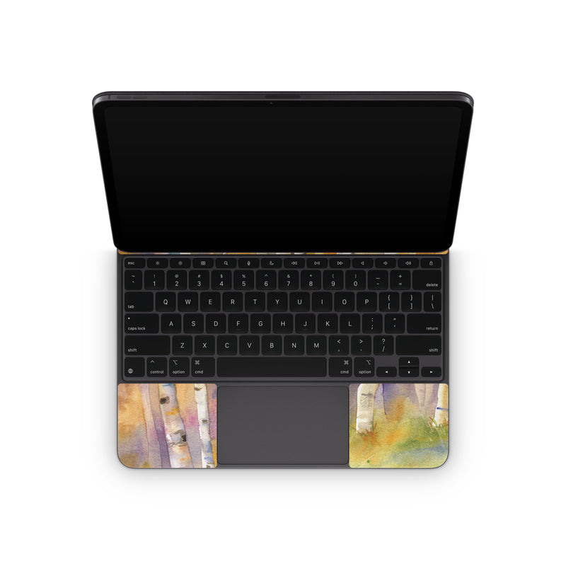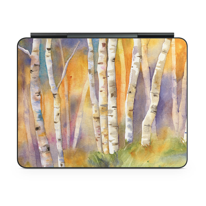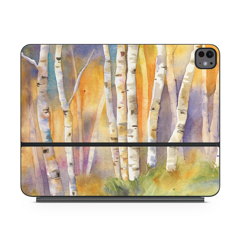 iStyles Magic Keyboard for iPad Series Skin design of Canoe birch, Watercolor paint, Tree, Birch, Woody plant, Painting, Plant, Birch family, Paint, Trunk, with orange, yellow, green, white, purple, blue colors, and tagged with nature.