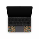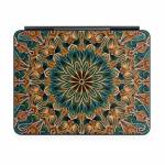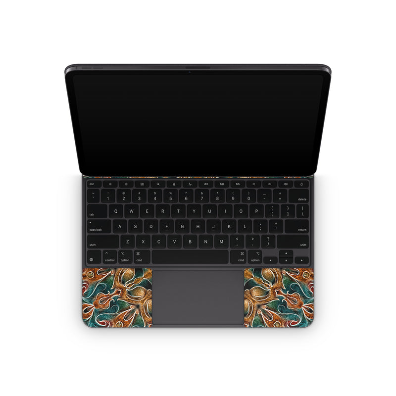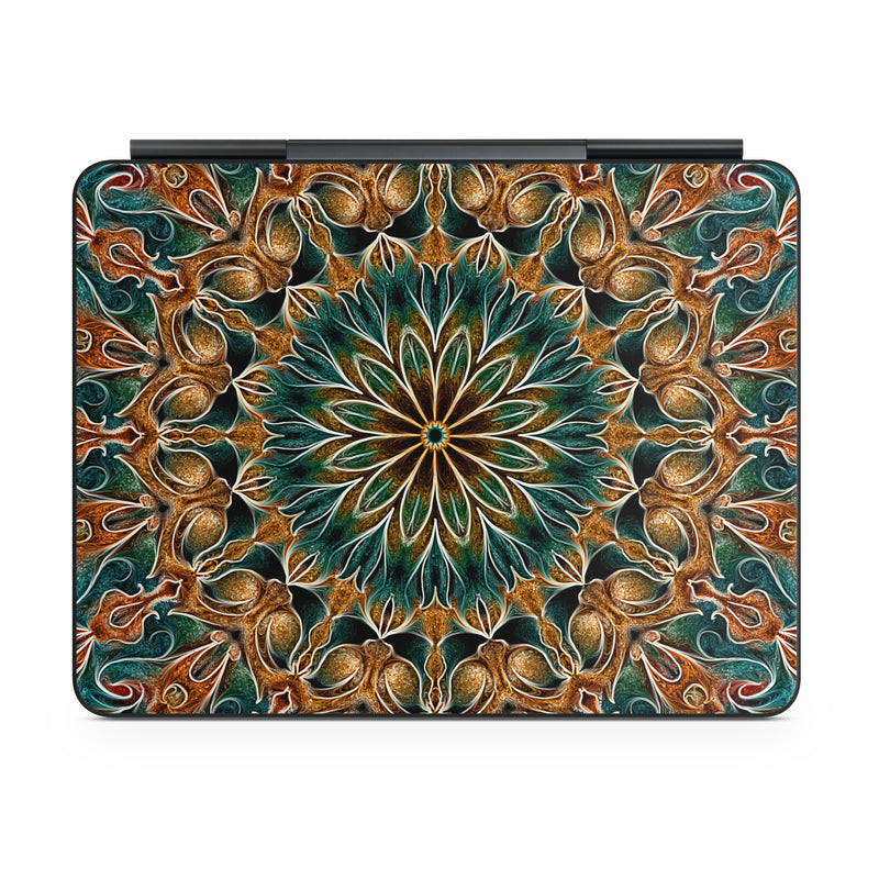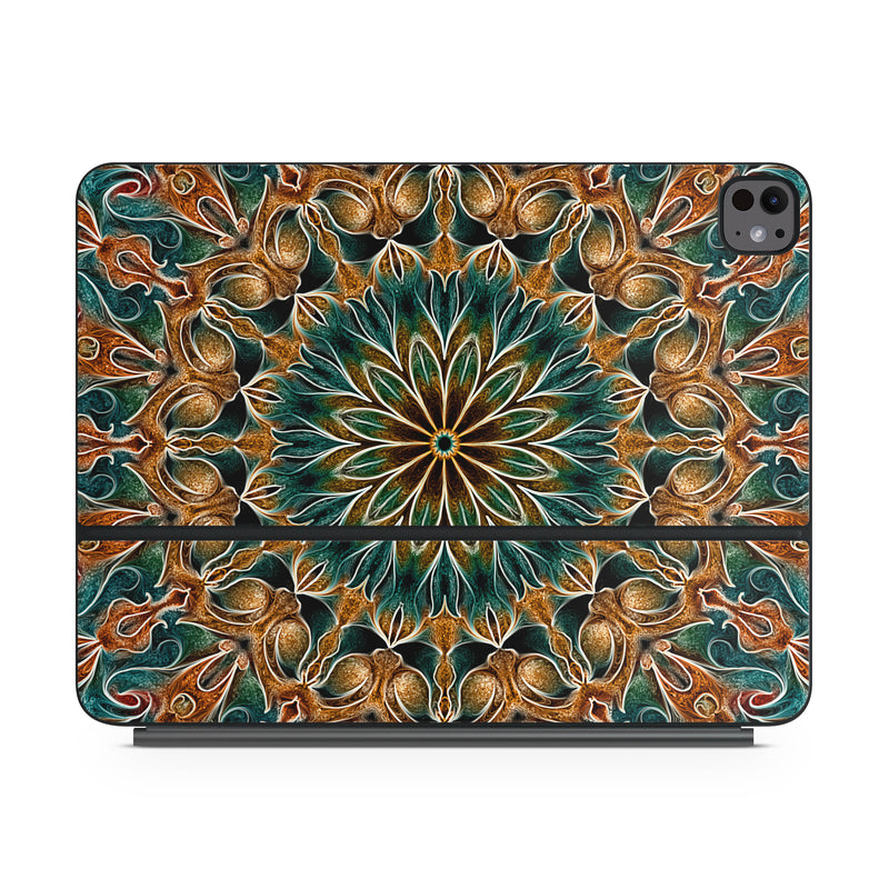 iStyles Magic Keyboard for iPad Series Skin design of Pattern, Symmetry, Textile, Art, Psychedelic art, Tapestry, Design, Visual arts, Kaleidoscope, Motif, with green, orange, yellow, brown, red colors, and tagged with patterns, abstract, orange, teal.