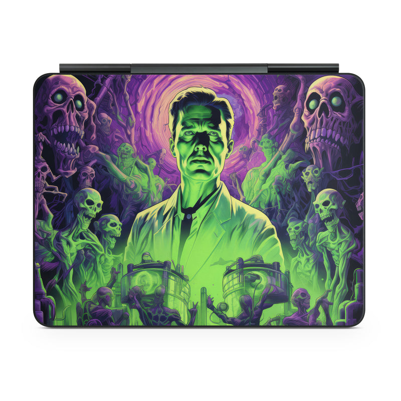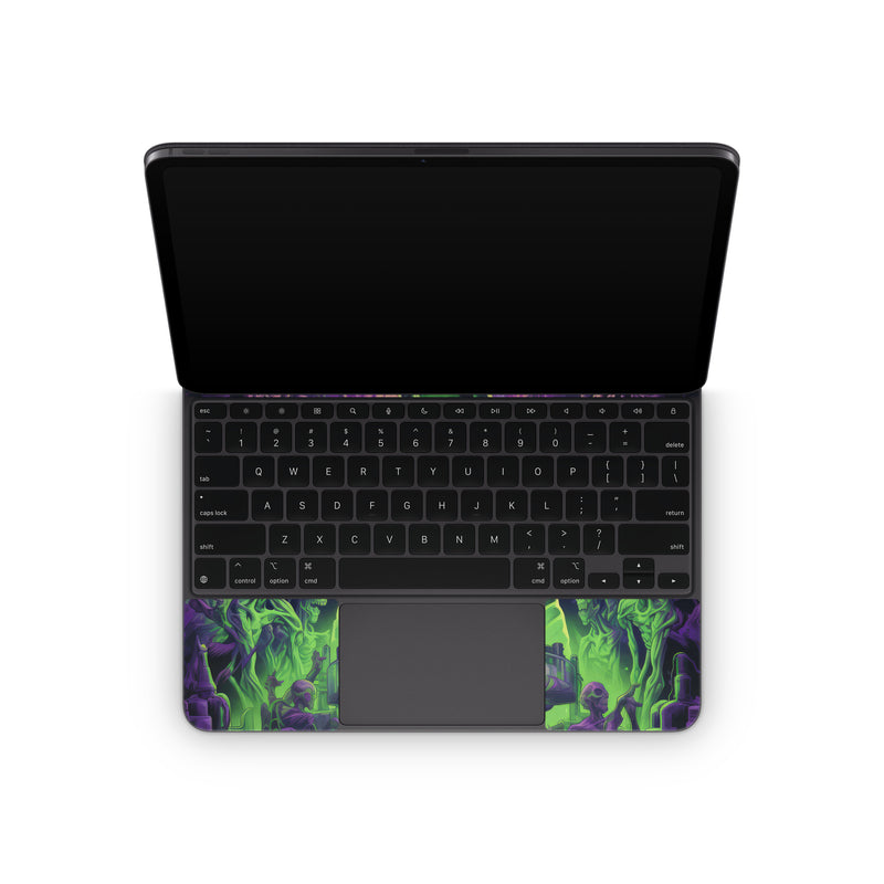 iStyles Magic Keyboard for iPad Series Skin design of Art, Cool, Fictional character, Illustration, Painting, Electric blue, Visual arts, Artist, Event, Drawing, with black, green, purple colors, and tagged with skulls, people, animals, halloween, zombie, scary.