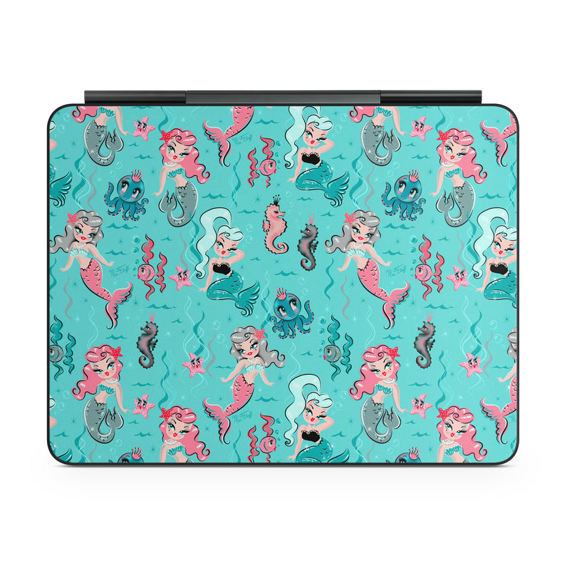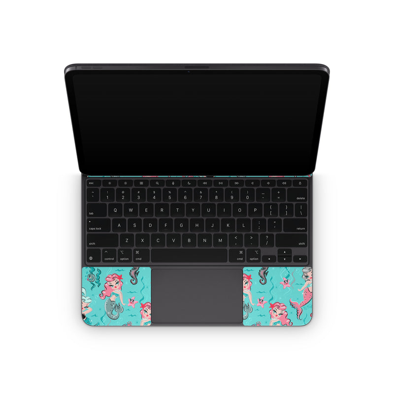 iStyles Magic Keyboard for iPad Series Skin design of Turquoise, Wrapping paper, Cartoon, Pattern, Textile, Aqua, Design, Gift wrapping, Illustration, Fictional character, with blue, pink, yellow, gray colors, and tagged with patterns, animals, people, fantasy, mermaid, mermaids, mystical, ocean, pastel, pattern, pinup, pinupgirl, sea, sealife.