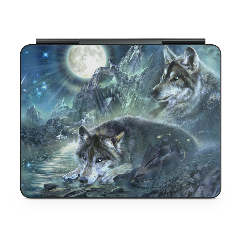 iStyles Magic Keyboard for iPad Series Skin design of Cg artwork, Fictional character, Darkness, Werewolf, Illustration, Wolf, Mythical creature, Graphic design, Dragon, Mythology, with black, blue, gray, white colors, and tagged with animals, space.