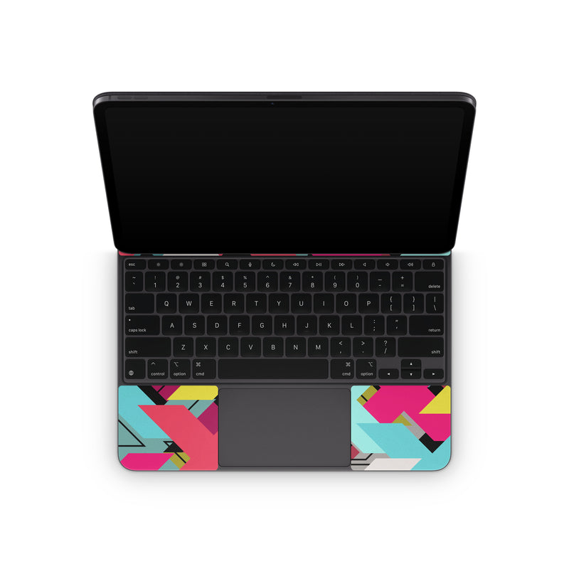 iStyles Magic Keyboard for iPad Series Skin design of Pattern, Graphic design, Line, Design, Triangle, Font, Illustration, Magenta, Visual arts, with yellow, blue, white, black, red, pink colors, and tagged with patterns, signs.