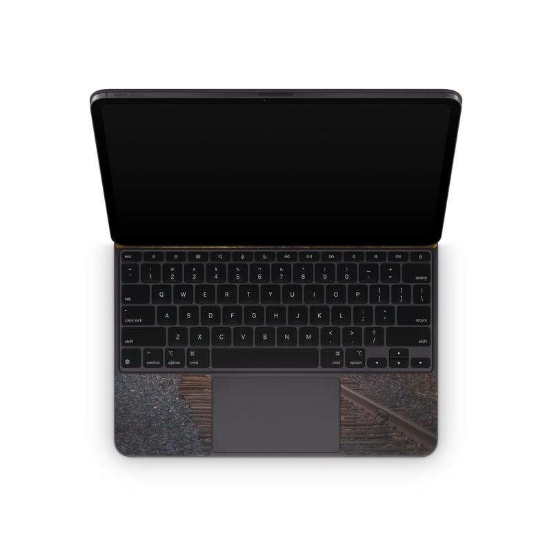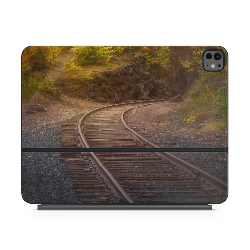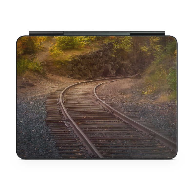 iStyles Magic Keyboard for iPad Series Skin design of Plant, Wood, Branch, Natural landscape, Road surface, Track, Grass, Tree, Thoroughfare, Twig, with brown, gray, yellow, orange, green, red colors, and tagged with nature, objects, nature, outdoors, photography, train, traintracks.