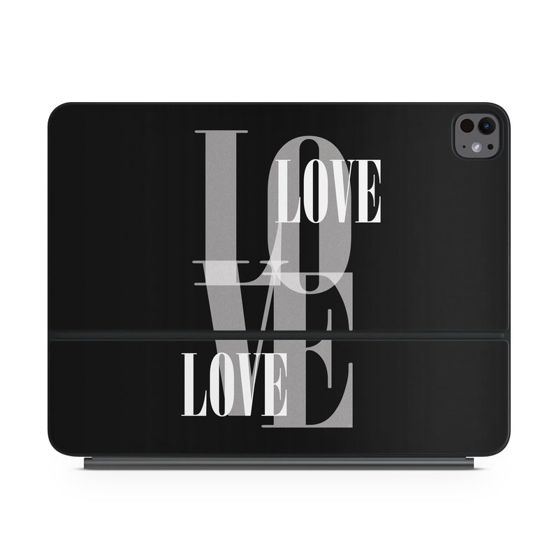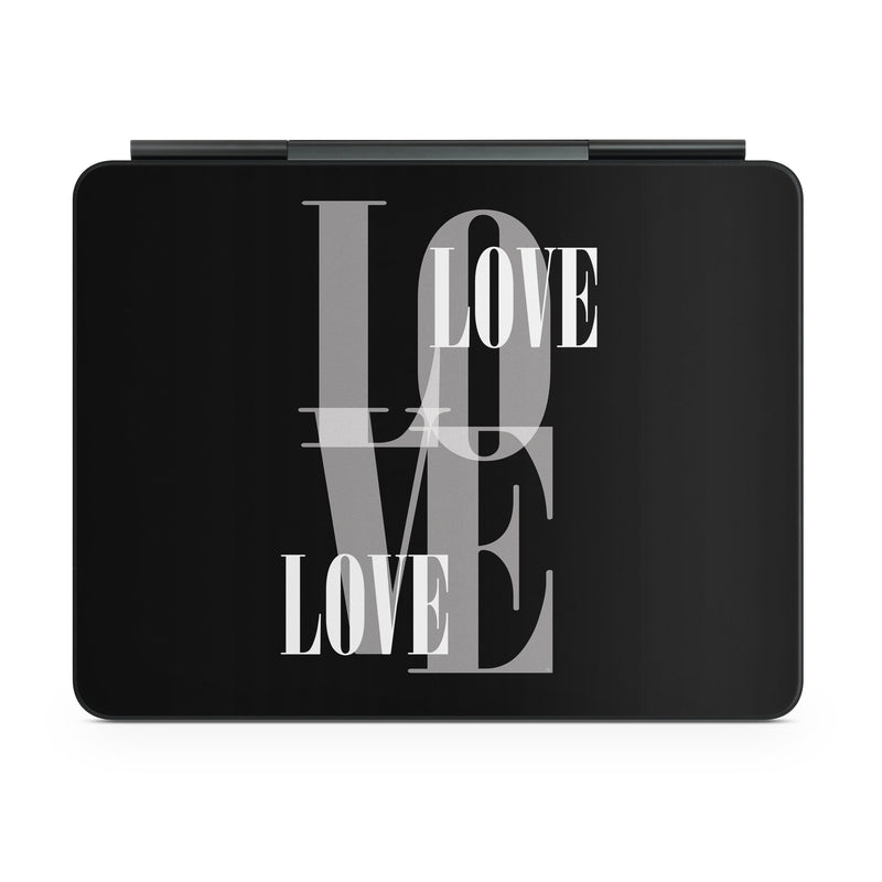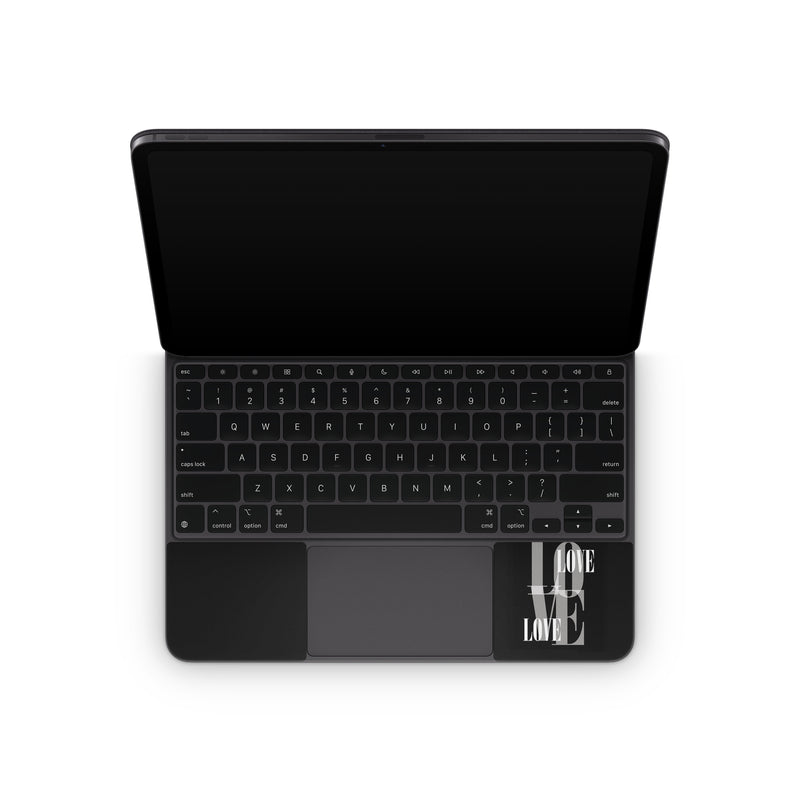 iStyles Magic Keyboard for iPad Series Skin design of Gesture, Font, Sleeve, Darkness, Logo, Brand, Graphics, Illustration, Terrestrial animal, Art, with black, white, gray colors, and tagged with signs, blackandwhite, grey, love, text.