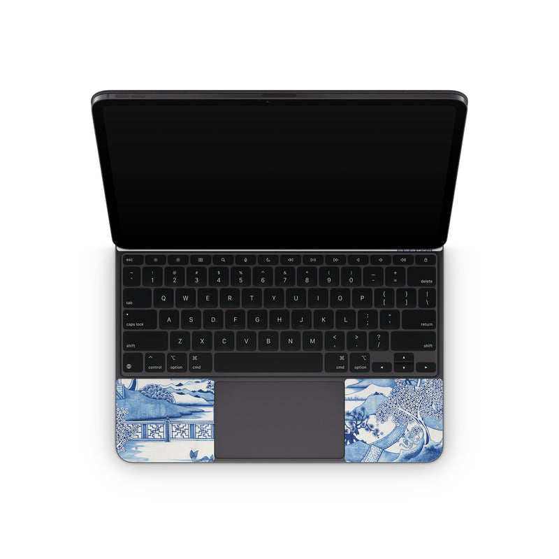 iStyles Magic Keyboard for iPad Series Skin design of Blue, Blue and white porcelain, Winter, Christmas eve, Illustration, Snow, World, Art, with blue, white colors, and tagged with urban, objects, animals, nature.